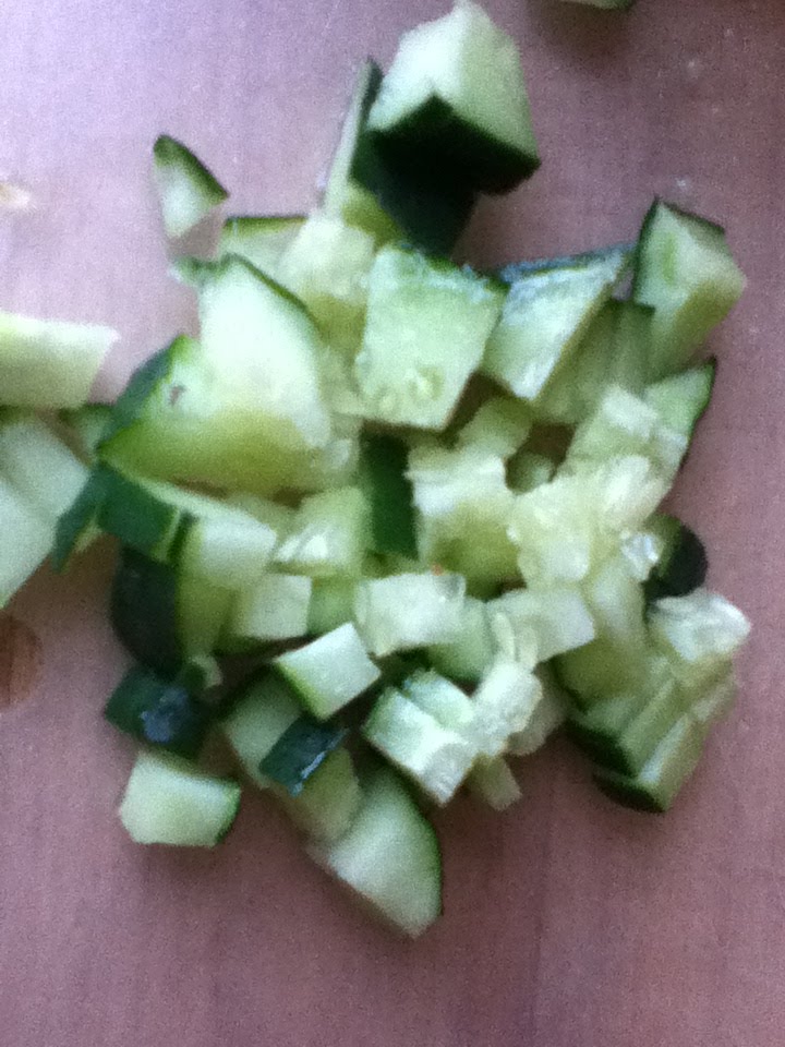 To dice your cucumbers, slice them thin. Then cut the slices into small pieces. You want the pieces to be approx 1/8".