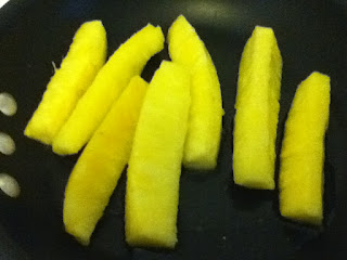 In a large sautéed pan, heat 1 tbsp olive oil. Add in pineapple and sauté over med-low heat. Let it sit there for a good 5 minutes then flip over to another side, repeat.