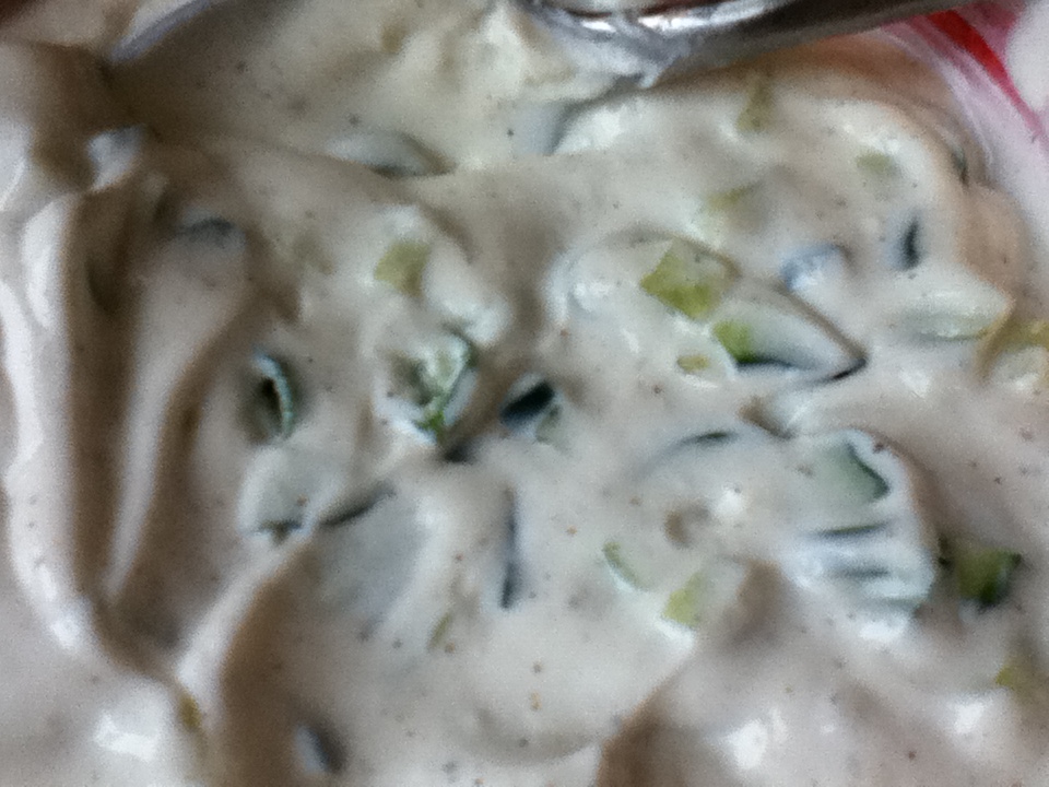 Gently fold the (peppers and) cucumbers into yogurt. Cover with clear wrap.