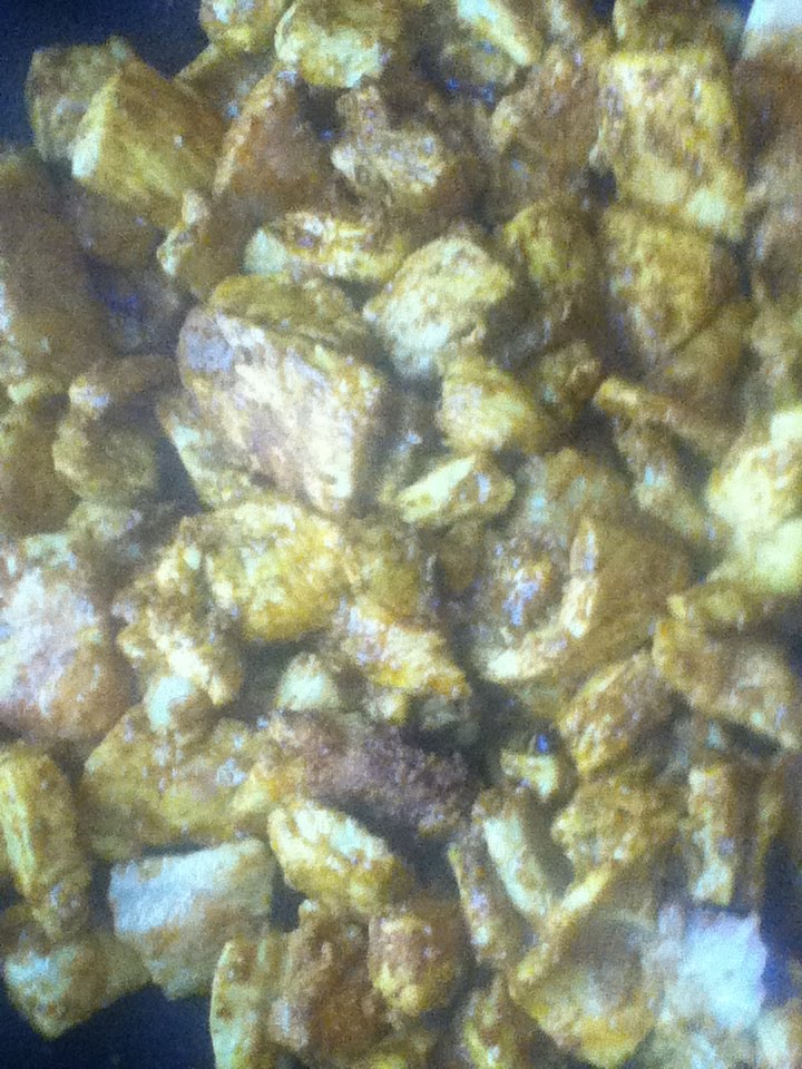 Wait 2 to 3 minutes and them add in remaining spice mix. This method will allow each piece to equally coat itself.