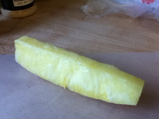 Prepare pineapple by removing skin, core, and slicing long ways into spears.